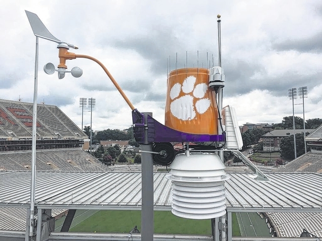 The tiger paw-painted weather station at Memorial Stadium has live streaming cameras, radar and data it displays online at http://pickens.weatherstem.com/clemson and on iPhone and Android apps, Facebook and Twitter.